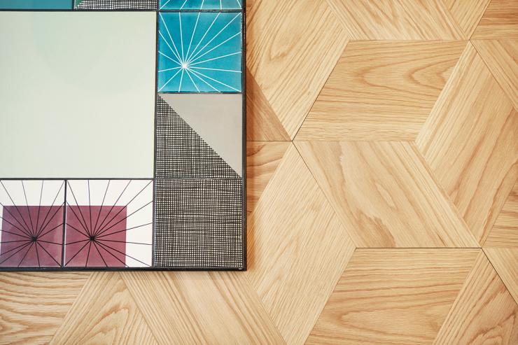 Hexparket by CarpEnter Cph & Hartmann. Hexagonal staves made in solid oak are laid to form an intricate design mimicking nature’s own geometric pattern based on equilateral triangles. The staves measure 370mm on all sides by 20.5mm thick, with an untreated surface to be finished on site. The natural grain structure of the timber adds texture and interest resulting in a lively, elegant floor.
