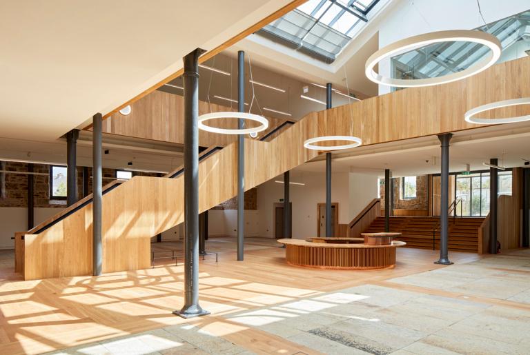 Purcell retained many of the buildings’ remaining structures and restored elements of the interior. Based on historic records, original cast iron columns were salvaged and incorporated in a new steel frame and brick gable walls at high levels were reinstated. For the floor, the original granite flagstones were carefully lifted and re-laid, installed alongside Junckers’ solid wide board oak flooring in a white-pigmented Nordic finish.