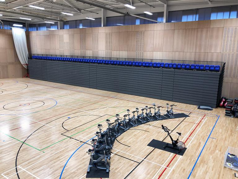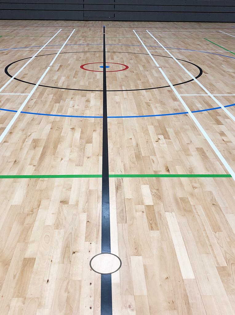The multi-purpose hall has been fitted with an A4 rated, sprung solid timber floor, in accordance with the specification recommendations issued by Sport England and the ESFA, the Government’s Education & Skills Funding Agency. The solid wood floor boards were laid onto our New Era cradle and batten system, with double battening installed underneath the area where retractable seating was to be positioned in order to spread the loading weight. Courtcraft’s partners MJ Courtmarkers line-marked the floor for badminton, basketball, netball and volleyball use, sealed with a topcoat of Junckers HP Sport lacquer.