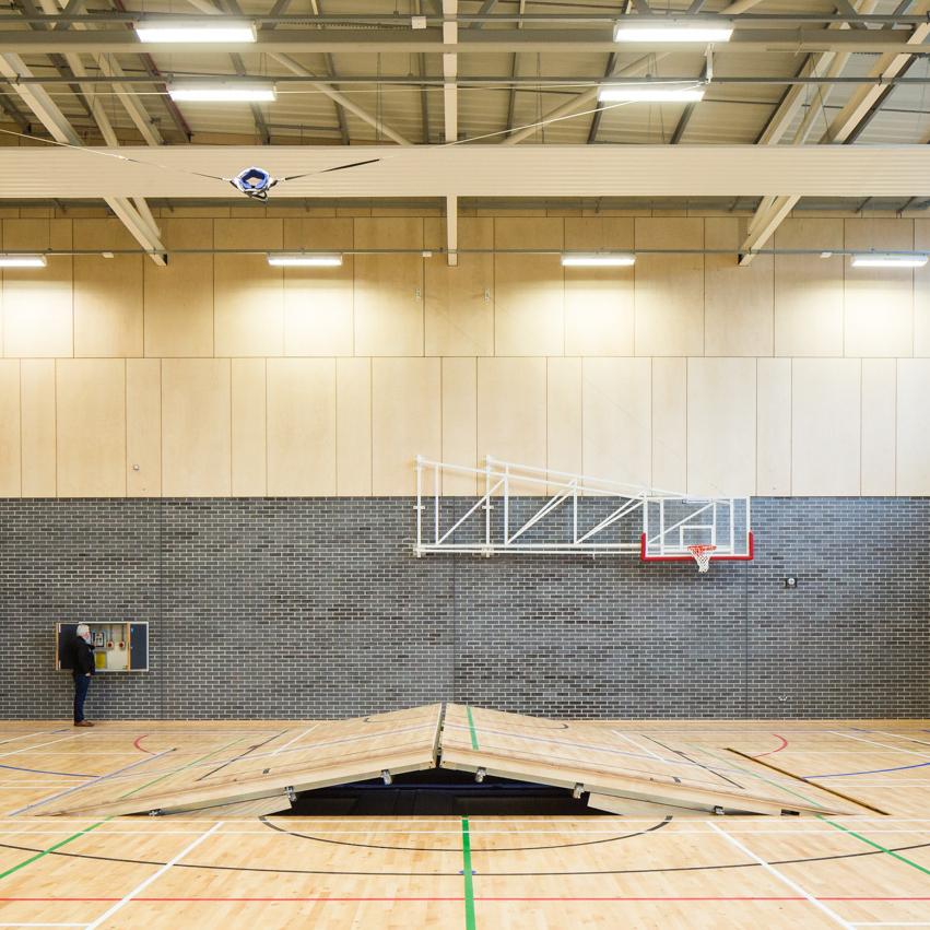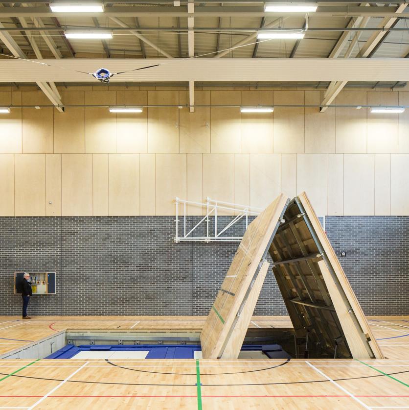 Have you ever seen anything like this before? This four-court sports hall at Newry Leisure Centre in Ireland has a a fold-away Junckers sports floor housing a trampoline pit. This clever construction was designed by Kennedy Fitzgerald Architects and constructed by Felix O’Hare & Co. Ltd.