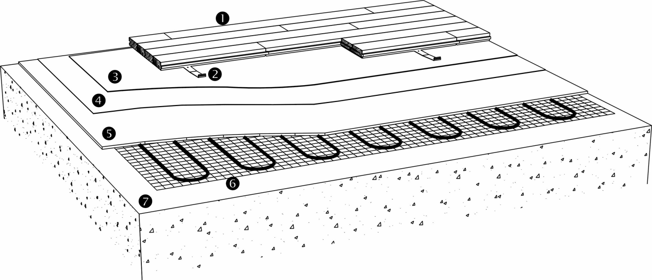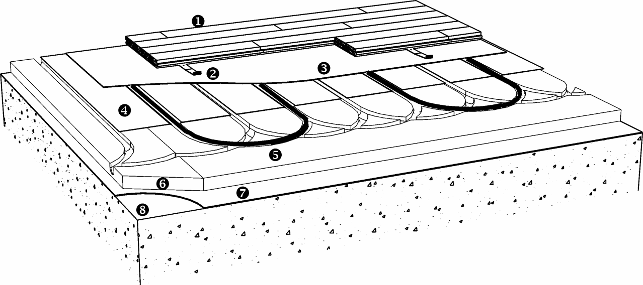 Clip floors can be laid on concrete or screeded subfloors with cast-in heating pipes or cables. It is extremely important that the floor heating system is designed to achieve a stable temperature across the surface of the concrete or screed. Following information applies to heating pipes in concrete or screeded floors.